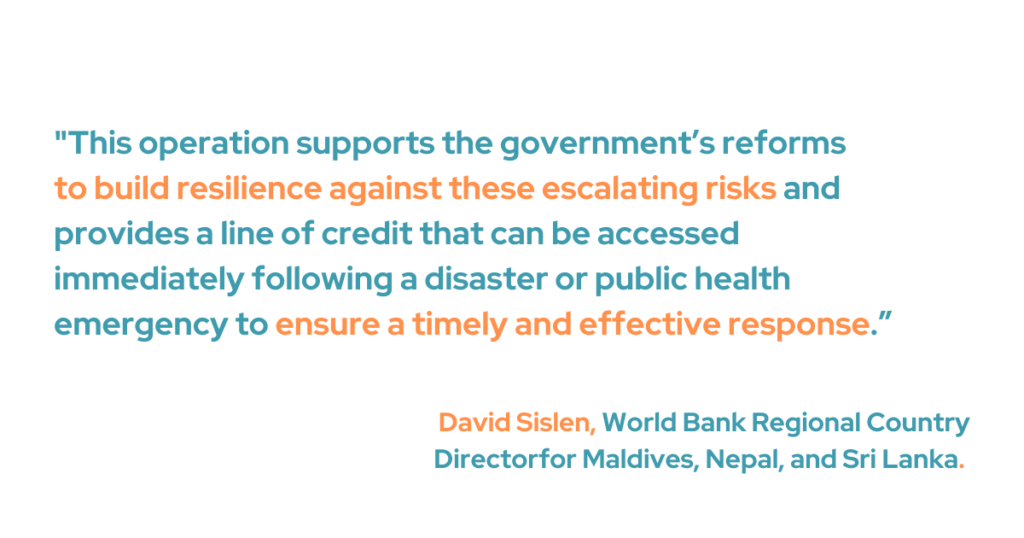 “This operation supports the government’s reforms to build resilience against these escalating risks and provides a line of credit that can be accessed immediately following a disaster or public health emergency to ensure a timely and effective response,” said David Sislen, World Bank Regional Country Director for Maldives, Nepal, and Sri Lanka.