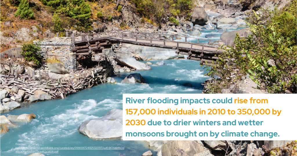 In addition, these natural disasters harm infrastructure and lower economic output in the country. In April 2024, a significant wildfire resulted in fatalities, structural damage, and a decline in air quality. River flooding impacts could rise from 157,000 individuals in 2010 to 350,000 by 2030 due to drier winters and wetter monsoons brought on by climate change. According to analysis, the detrimental effects of floods on constructed infrastructure may be responsible for over half of the nearly 7% GDP decline anticipated by 2050.